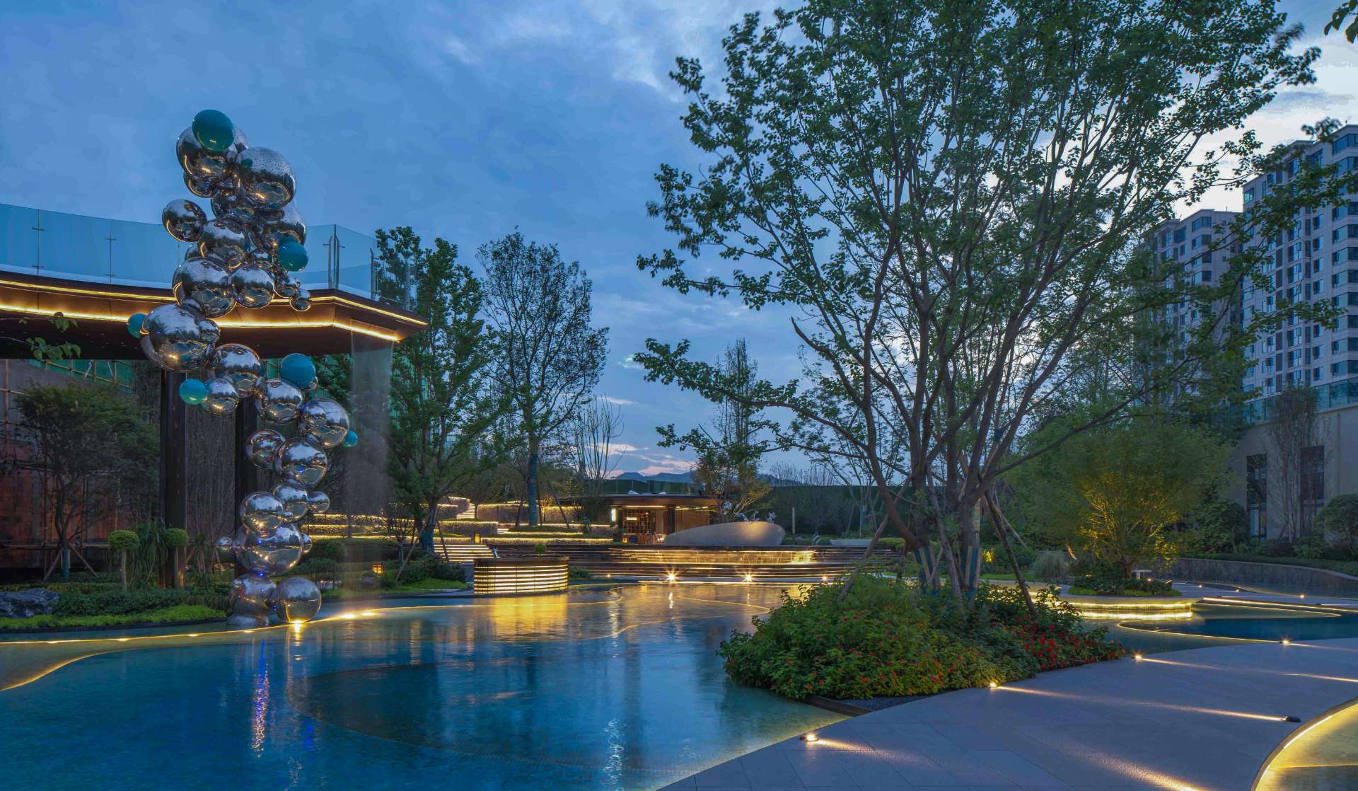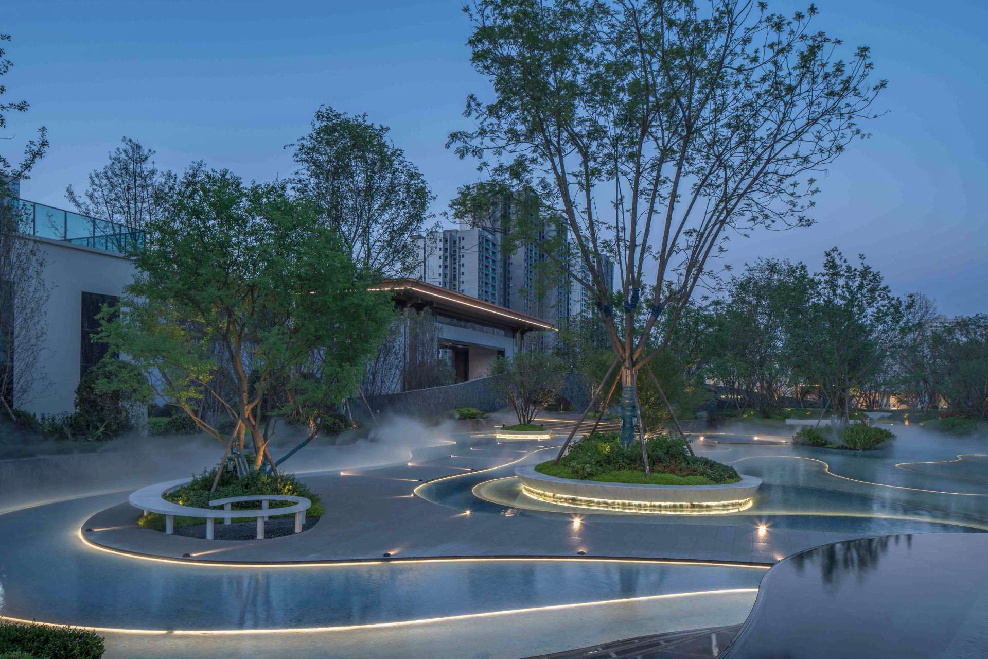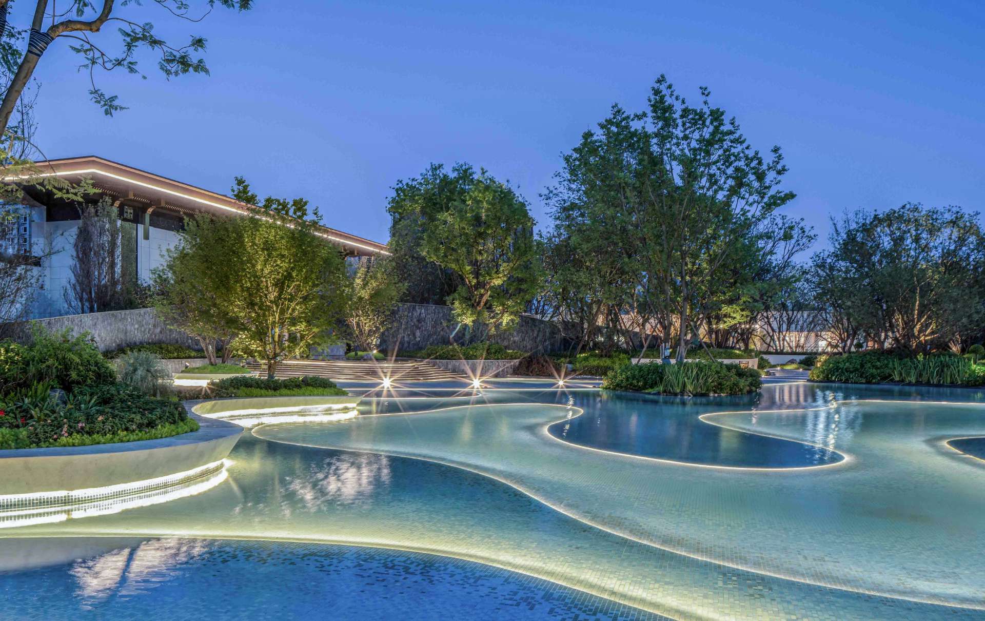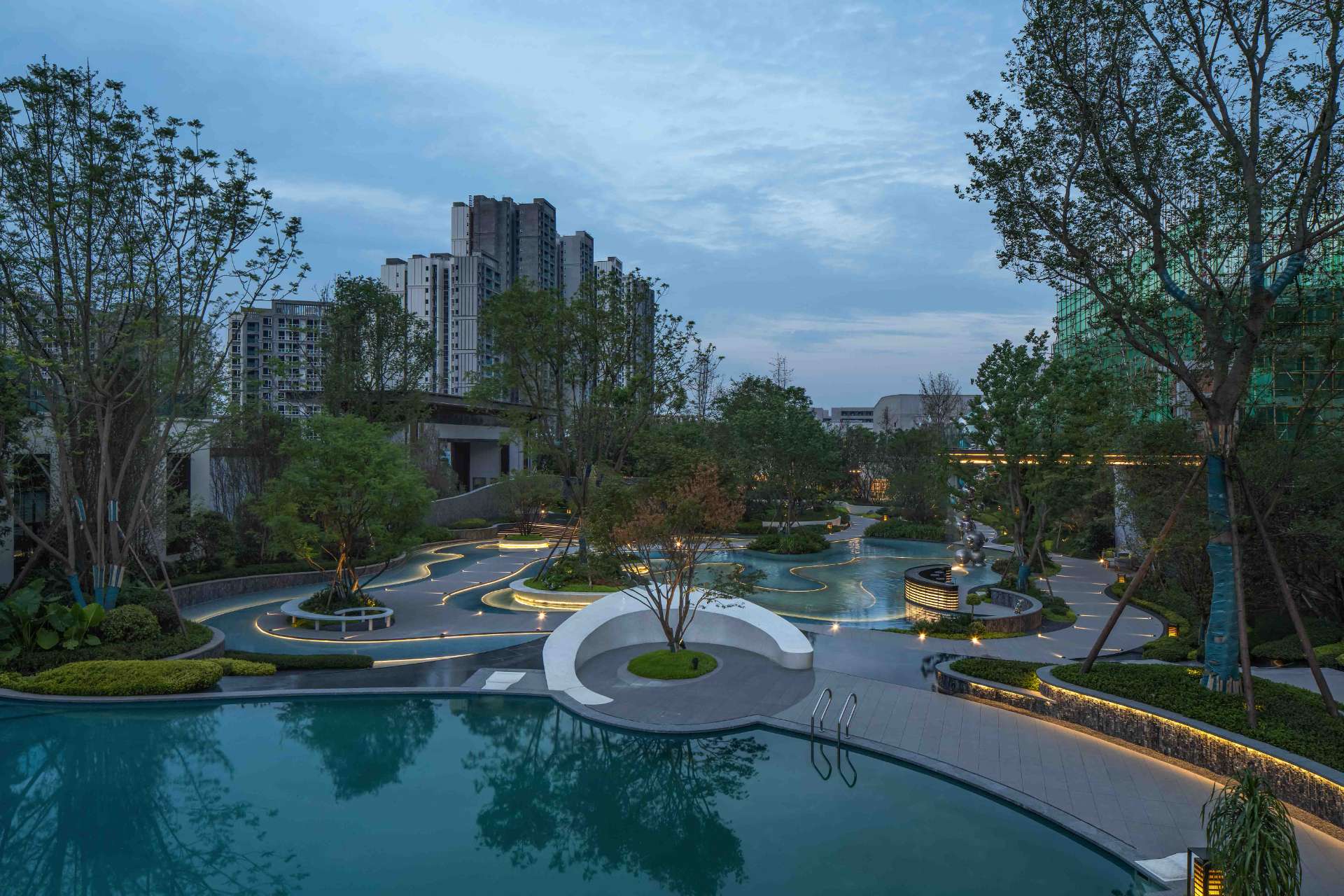 奔走于繁忙都市中,一份闲适,一份惬意便是现代都市人的心之向往。 当现代中式遇上山水度假,用现代的手法去演绎现代度假生活,于空间中对城市山水的呈现融于生活体验之中,于场地中寻得一份悠闲自然的心境。 以自然中山、林、溪、谷之景,与场地相互融合,唤起居者视觉、听觉、触觉和内心的连锁变化。 通过“入山”“探谷”“游溪”“玩水”,打造多重主题、多样空间、多种氛围的景观空间。 采用东方极简的方式,塑造山水人居空间,还原生活的本真,打造理想人居。